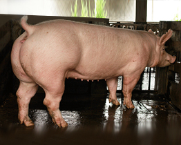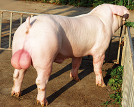 祥欣美系杜洛克豬背寬臀碩、體長腿粗、膘薄肌深、快長省料。祥欣杜洛克115kg體重日齡平均約160天;70至130公斤體重區間料肉比2.5。是二元母豬(法、丹、美、加)的最佳配套伴侶。